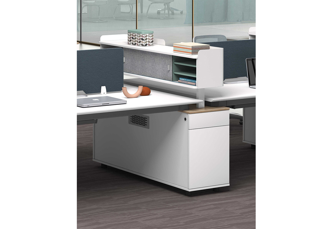 1.工藝:采用(yong)E0級刨花板貼三(san)聚氰胺飾面(mian) 2.封邊(bian):采用(yong)優(you)質PVC封邊(bian) 3.屏風:ML403藍色皮紋無框桌屏; 4.五(wu)金(jin)(jin):鋼制文件(jian)架擋板(壁(bi)(bi)厚(hou)1.5mm)+1.5mm壁(bi)(bi)厚(hou)鋼腳+1.6mm壁(bi)(bi)厚(hou)鋼制橫梁(liang); 5.配件(jian):優(you)質鋁(lv)合金(jin)(jin)散熱(re)蓋(gai)+優(you)質鋁(lv)合金(jin)(jin)趟門配件(jian)+鋁(lv)合金(jin)(jin)拉手+優(you)質ABS圓(yuan)柱形(xing)調節腳; 6.走線(xian):臺(tai)面(mian)配OP線(xian)蓋(gai); 7.選(xuan)配:可選(xuan)配多款線(xian)槽;