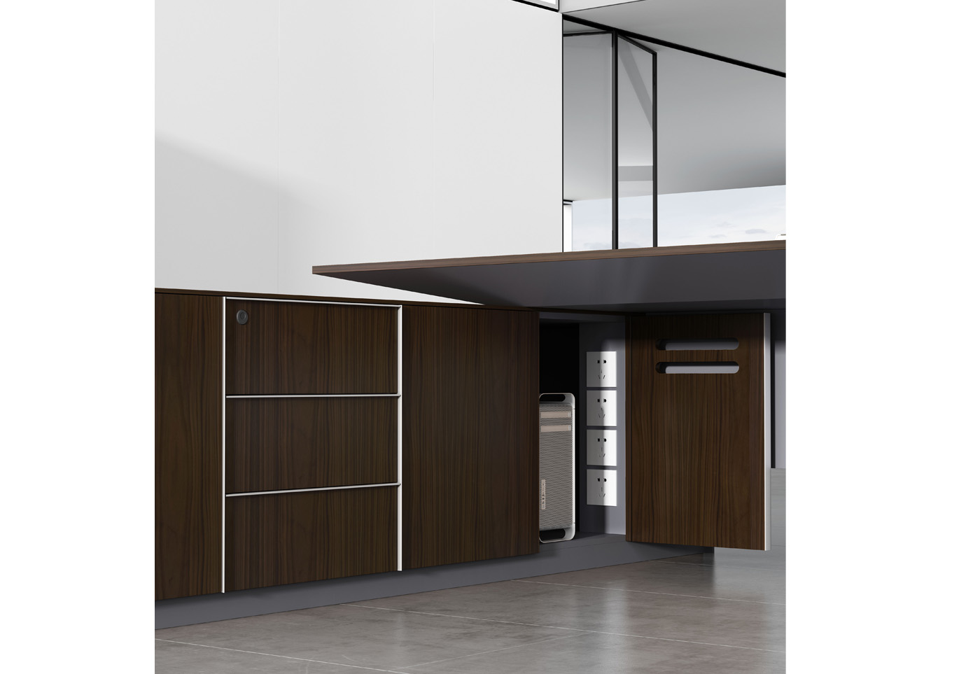 1.基材(cai):采用(yong)E0級中密(mi)(mi)度纖(xian)維板+0.6mm天然木皮; 2.油漆:臺灣大寶水性凈味漆; 3.配(pei)件:“BIM”牌 緩沖門鉸+“BIM”牌阻尼導軌+指(zhi)紋式智能密(mi)(mi)碼(ma)鎖+集成線盒(he)(he)+通(tong)體拉手; 4.走(zou)線:副(fu)柜內部走(zou)線,內配(pei)?80圓形過線盒(he)(he),配(pei)OEXH303A集成插座; 5.班(ban)臺分左右(you); 6.選配(pei):皮墊(dian);